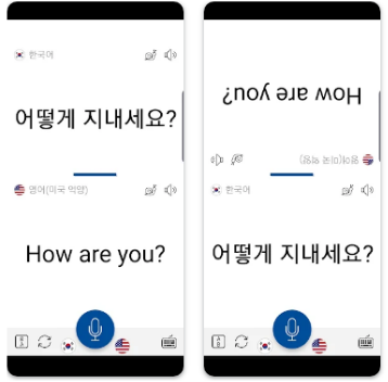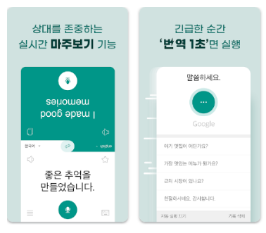 - 실시간 마주보기: 상대방이 쉽게 읽을 수 있도록 번역 결과를 반대로 보여주는 양방향 대화 기능