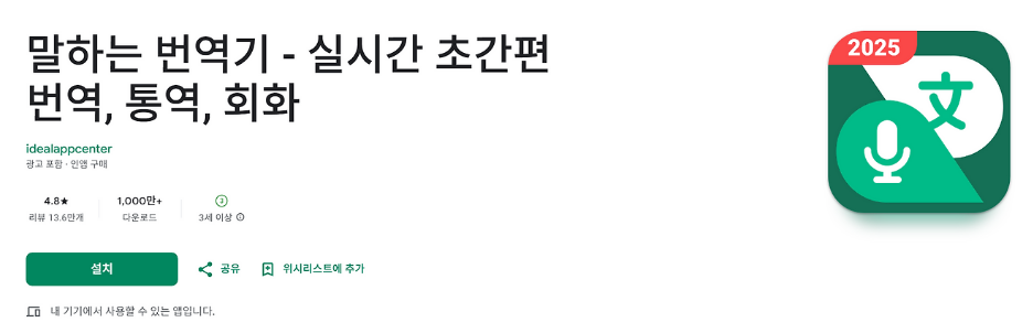 “말하는 번역기”는 실시간 번역과 통역 중심의 직관적 번역 앱으로, 외국어 의사소통을 쉽고 빠르게 돕는 실용적인 도구입니다. 특히 상대방이 읽기 쉽게 번역 결과를 거꾸로 보여주는 기능이 있어 대면 회화 시 활용도가 높습니다.